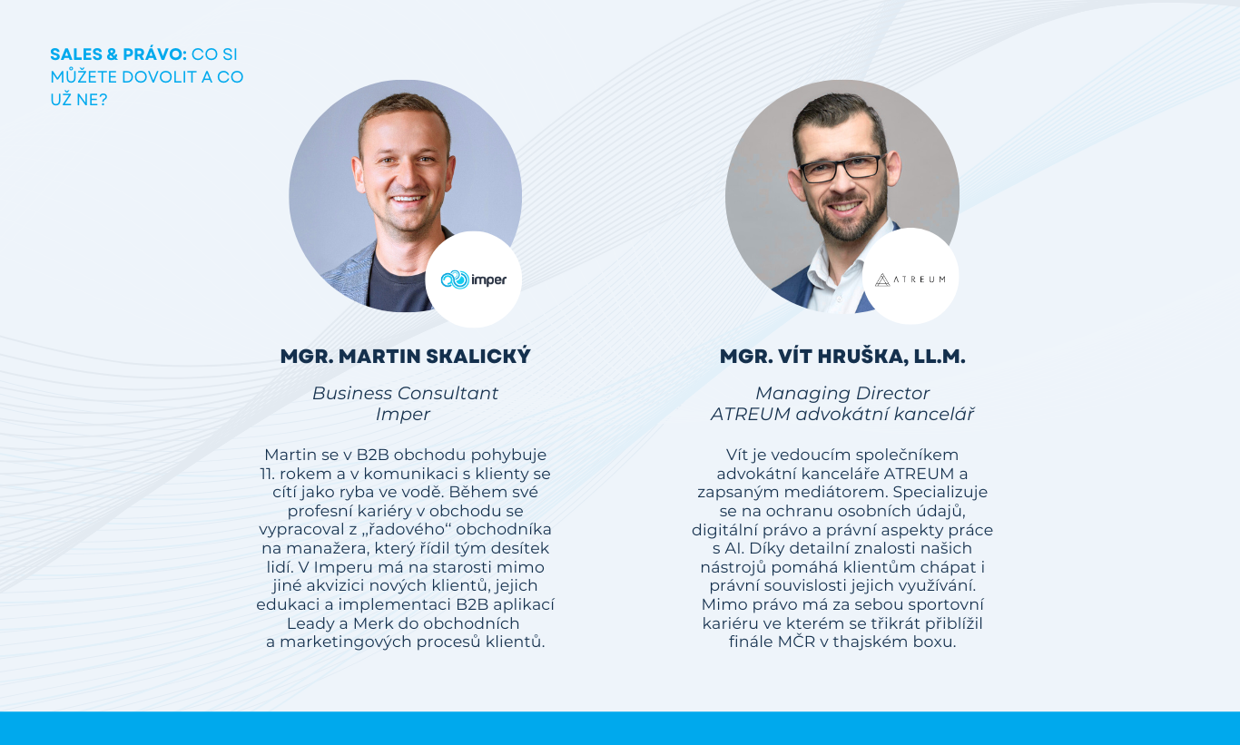 Jménem společností Imper (Saleskit) a advokátní kanceláře Atreum vás zveme na byznys snídani, během které probereme, jak dělat obchod efektivně a zároveň v souladu se zákonem.